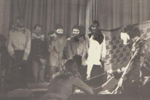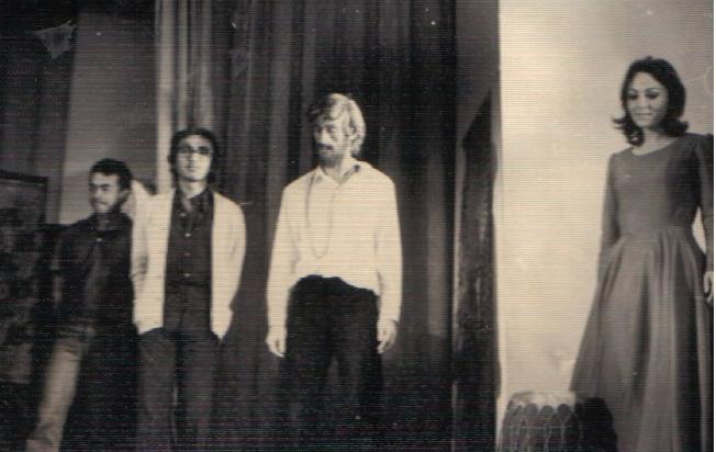 3 photos d’une pièce de théâtre Caligula d’A Camus : profs de la capitale, dont moi prof à Galliéni et d’autres collègues d’établissements différents plus des élèves de Galliéni.